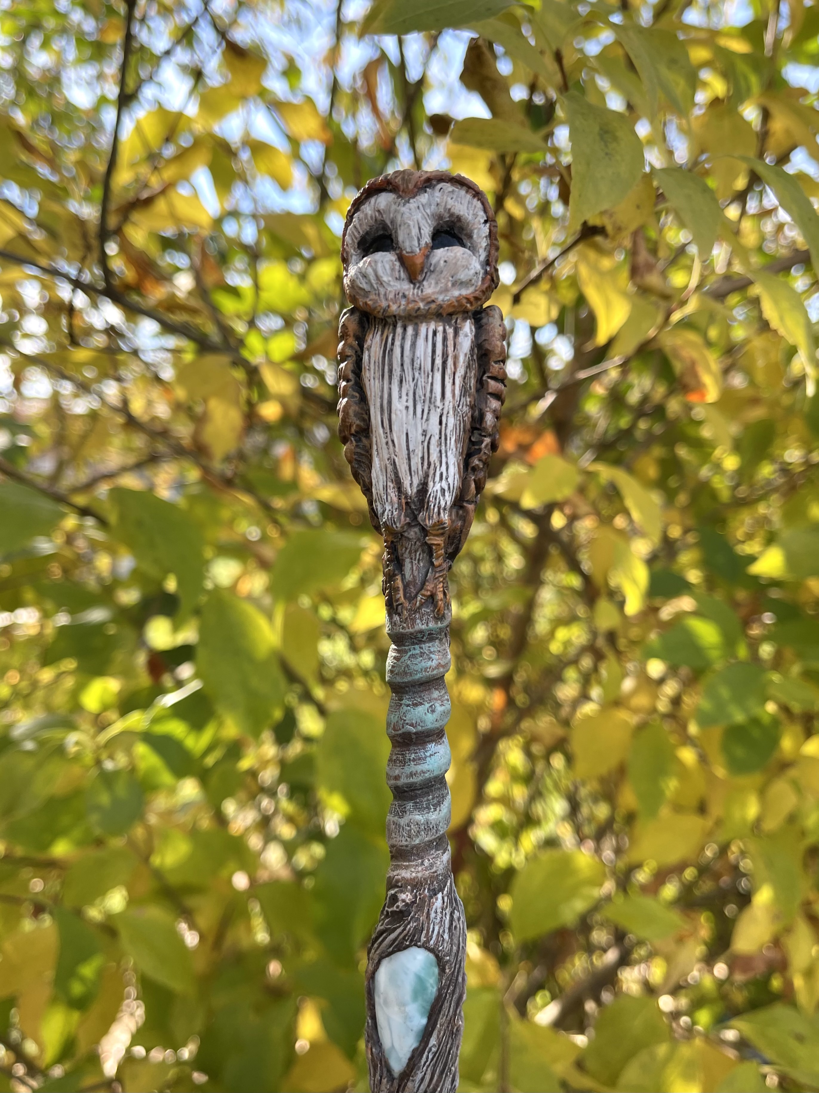 We’re usually pretty consistent about what we put out on these newsletter blasts, but you know what hasn’t been consistent? The weather! Well, I guess it’s been consistently rainy. There haven’t been a lot of opportunities for Rhianna to get any really nice pictures of the foliage outside, so we’re digging back a little farther in our timeline for this adorable little Barn Owl Wand. A bit of larimar adds to the magic here, and might help this little fellow take flight, to a new wielder!